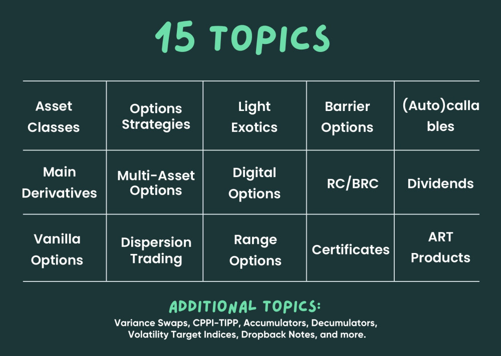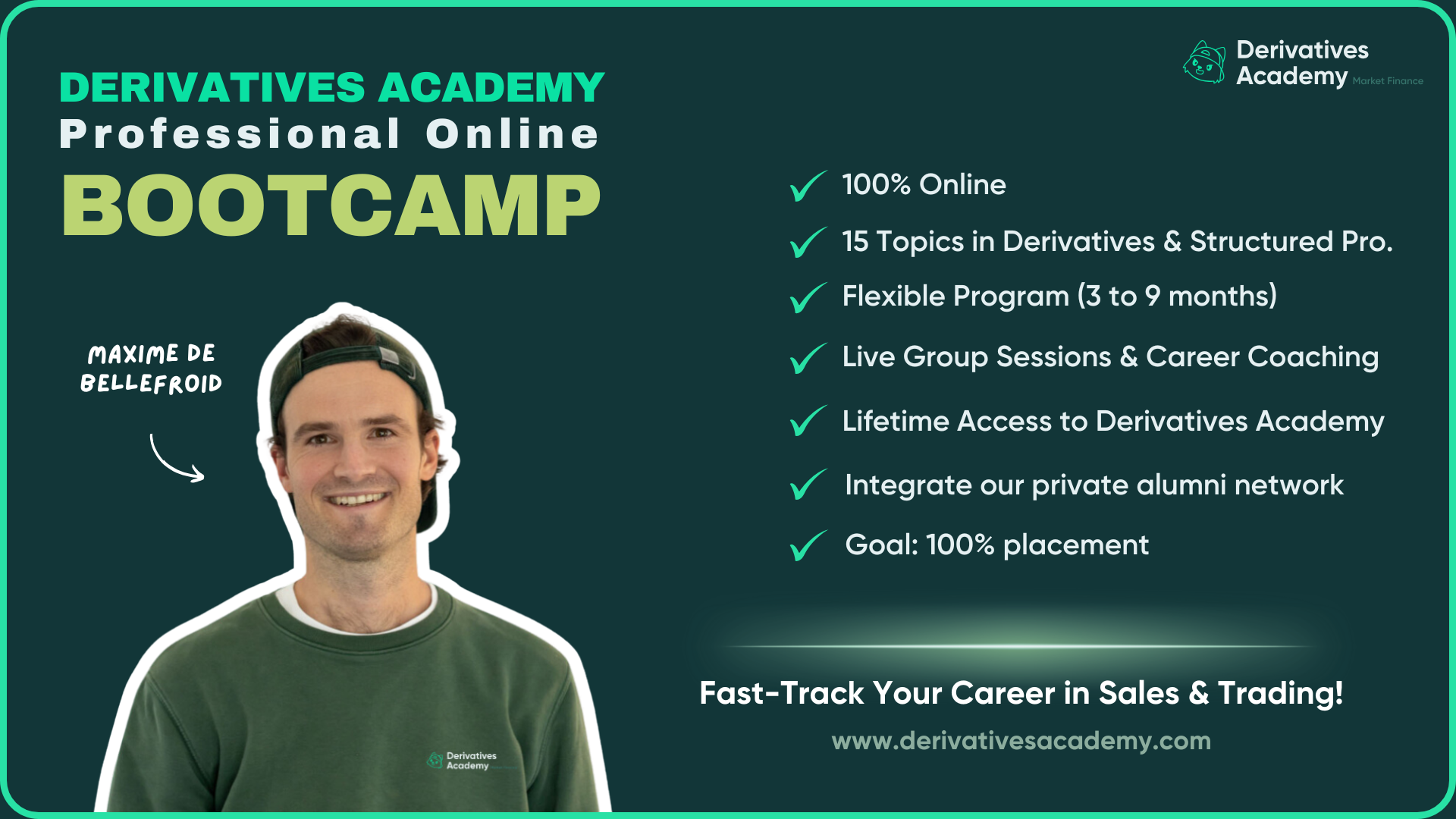 The Bootcamp is a flexible online program lasting between 3 and 9 months, allowing you to progress at your own pace.The training is designed to provide participants with a deep understanding of derivatives and structured products.