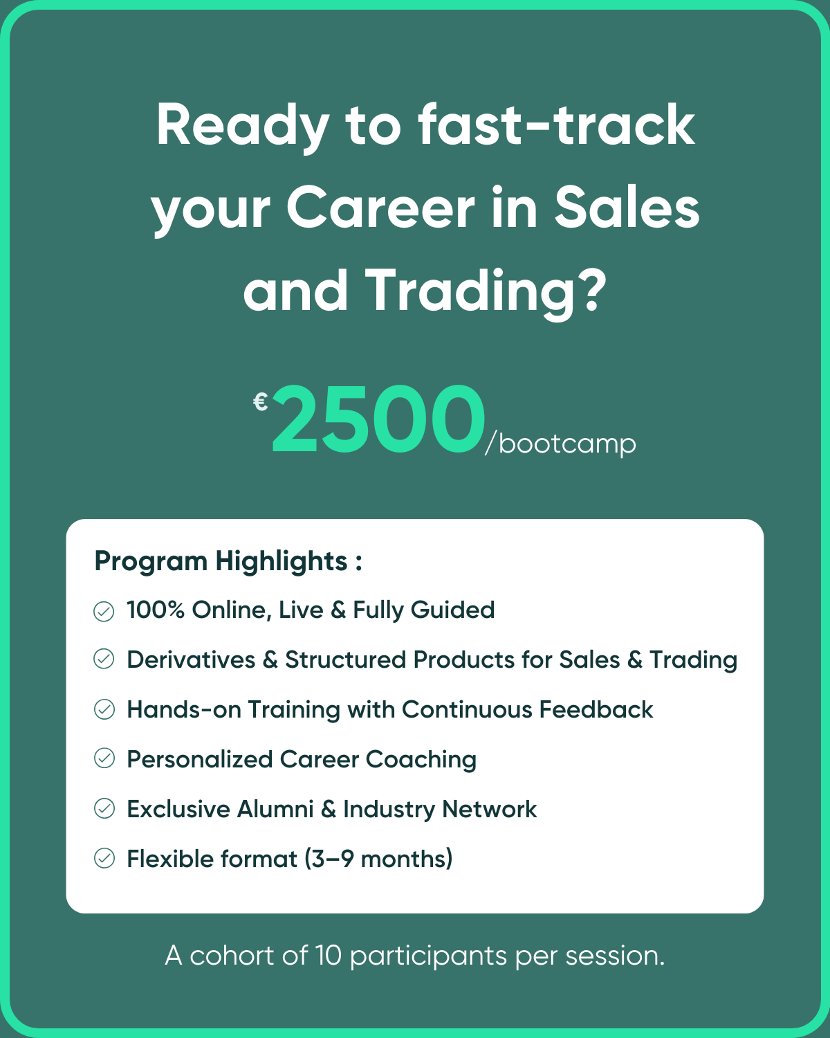 Our program aims to provide our alumni with the most advanced understanding of Derivatives and open them the door to a career in Sales and Trading. Clearly, it is not for everyone. It demands a strong level of commitment. It is designed for those ready to excel at the highest level. Rooted in our core value of meritocracy, our certification is set to become a premier benchmark in Sales and Trading.